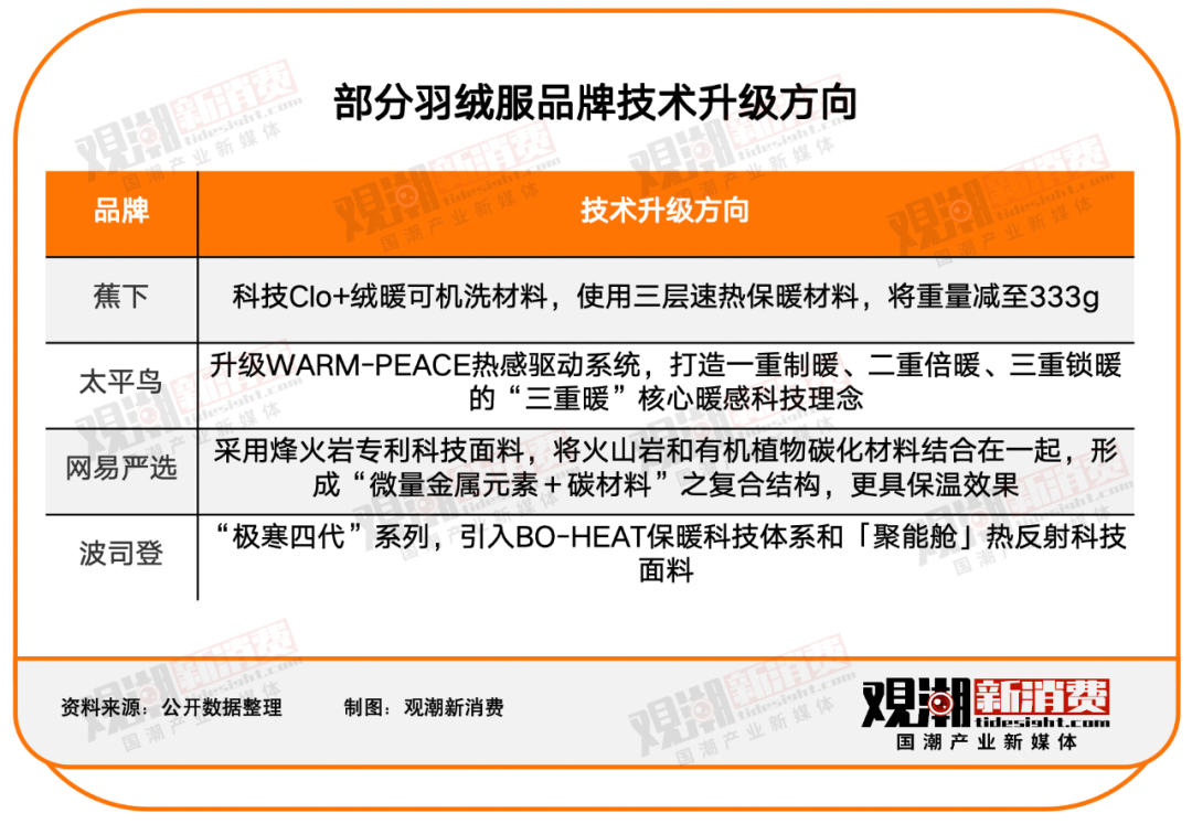 如何通过技术升级将羽绒服制作得更轻便、更保暖,是品牌功能升级最为主要的方向之一。新晋品牌蕉下、传统品牌波司登等均在技术革新上有所布局。