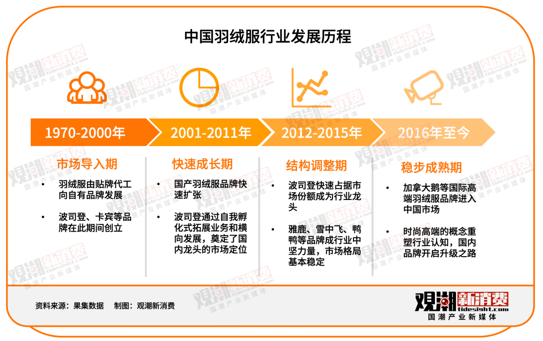 2000年以后,伴随国民消费水平提高,各大国货品牌快速成长,市场进入快速发展期。2001-2011年十年间,波司登孵化系列子品牌,分别针对不同的消费群体横向发展,并在2007年登陆港股,成为国内首家羽绒服上市企业,奠定了国内行业龙头的地位。