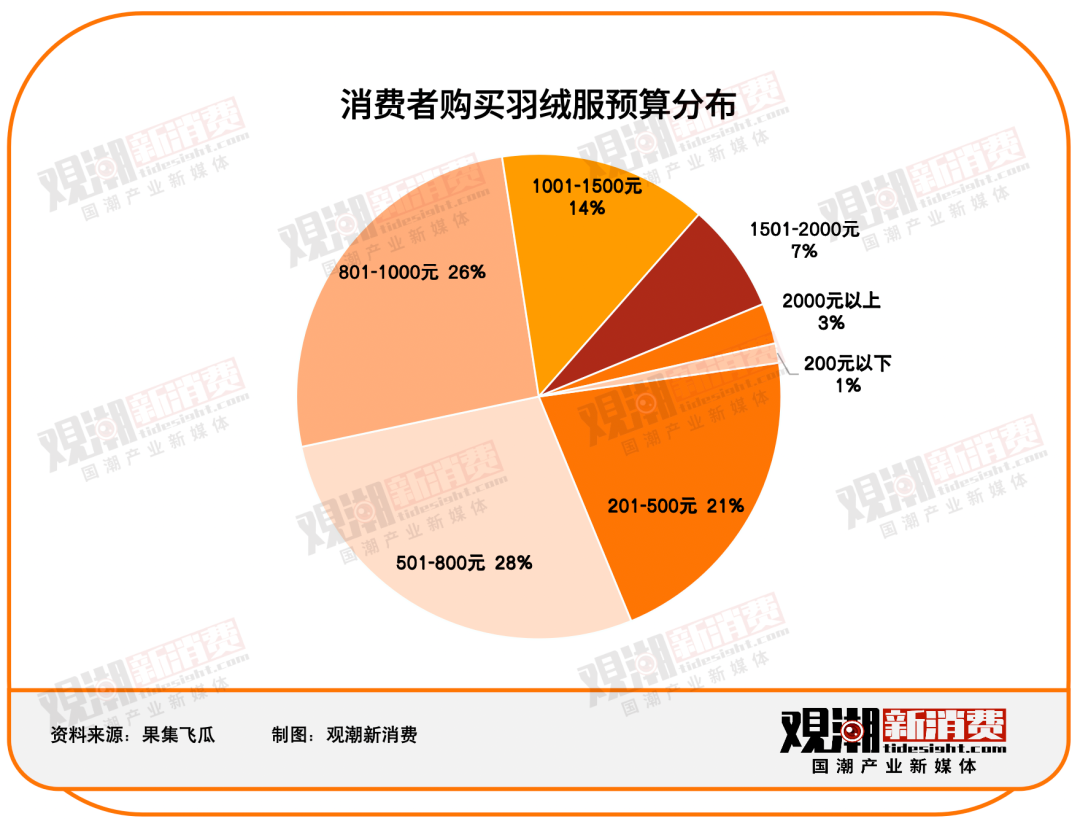 在中高端羽绒服市场的角逐之外,平价羽绒服品牌依然是大众消费者的选择。果集飞瓜数据显示,过半数的消费者购买羽绒服的预算集中在501-1000元之间。这也是鸭鸭、艾莱依、雅鹿、千仞岗等传统国货品牌竞争的主战场。