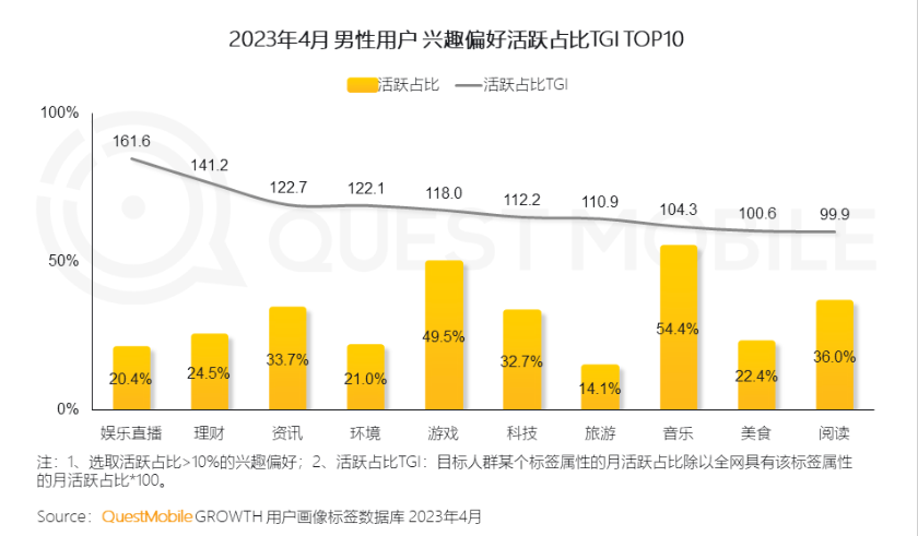 具体来看,男性人群对游戏、音乐、科技、咨询等多个方面体现浓厚的兴趣,泛娱乐属性突出。