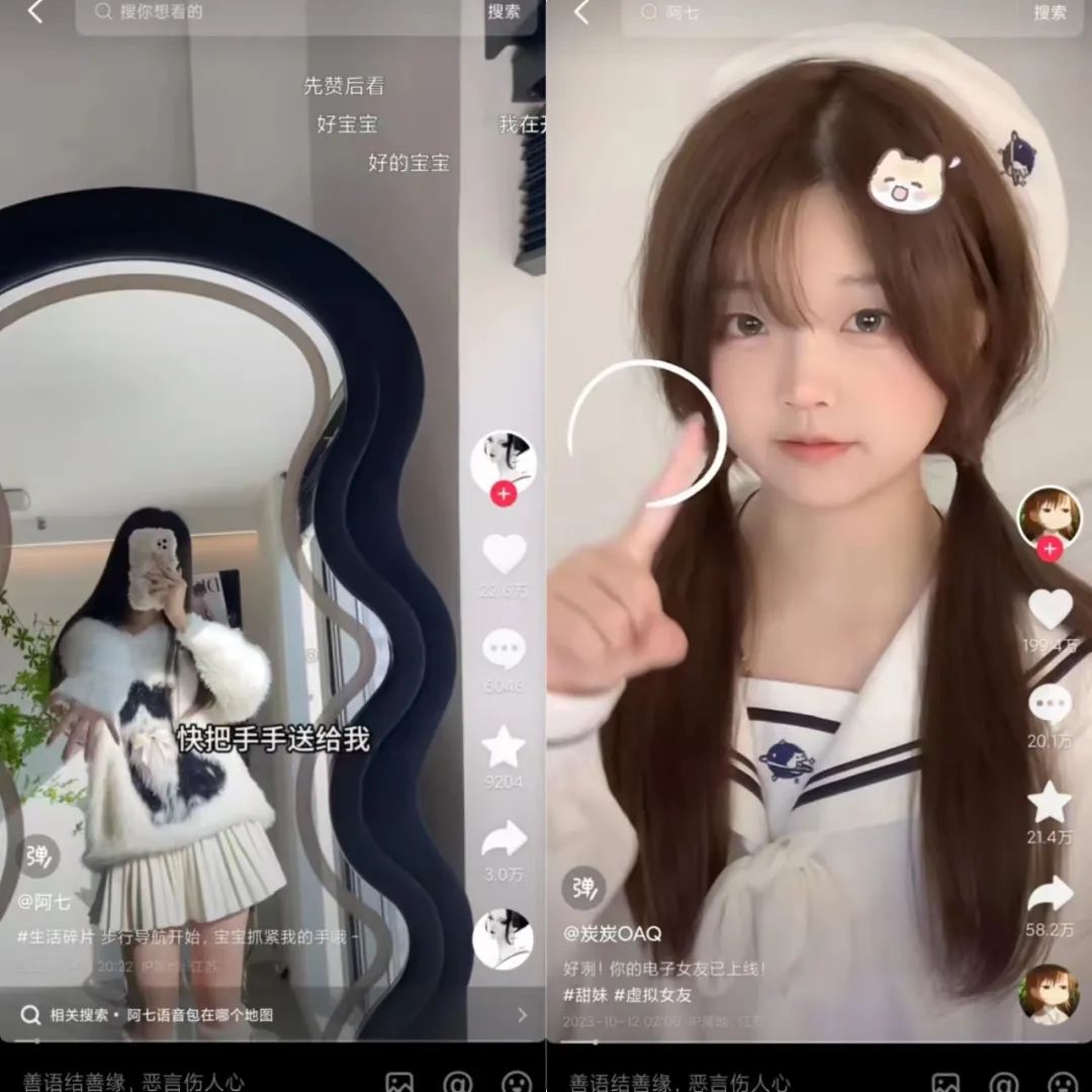 通过短视频,带入第一人称视角的拍摄方式早已存在,在明星的物料之中经常会看到此类视频,目的就是使得粉丝更有男/女友的身份代入感,而“电子女友”的批量出现无疑是扩大了此类视频的影响,满足了更多男性的情感需求。