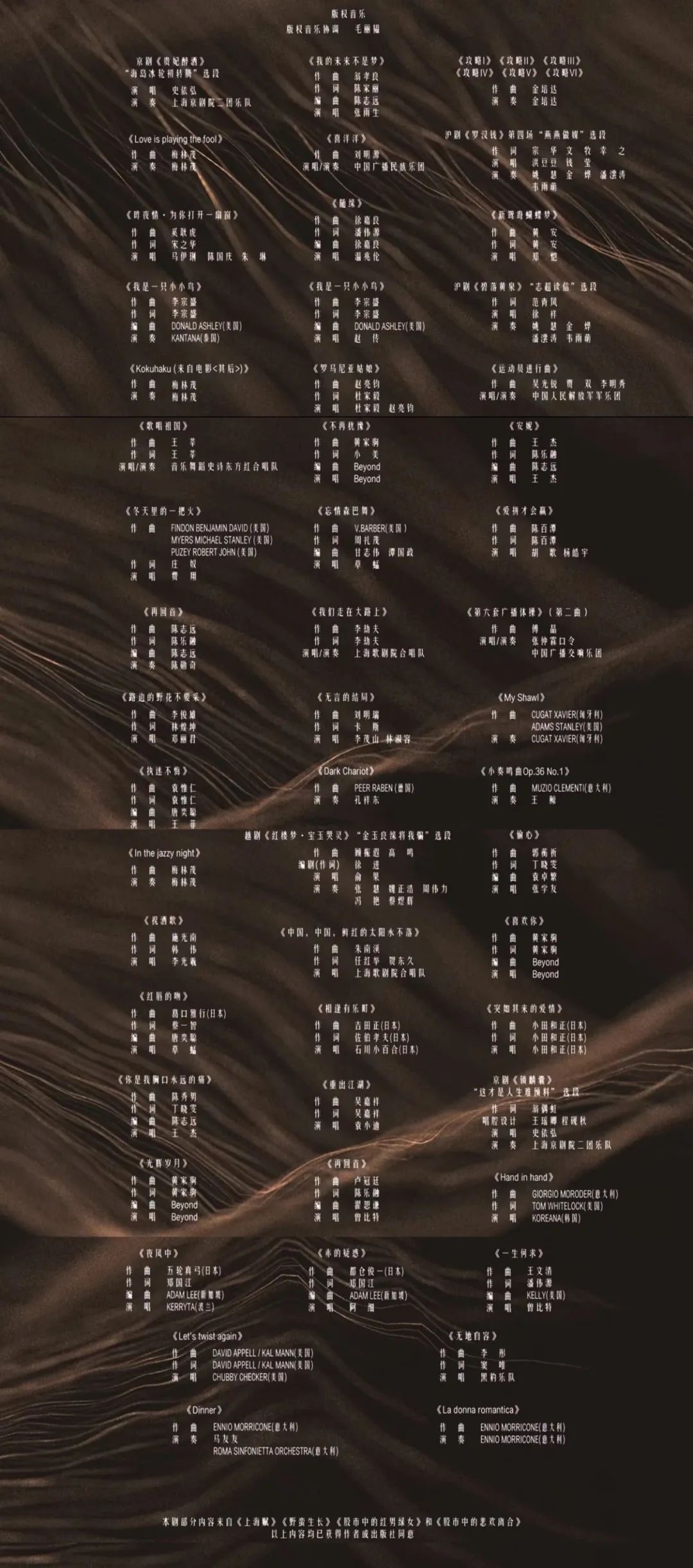 同样,日本配乐大师梅林茂为《一代宗师》和《2046》创作的配乐《La Donna Romantica》、《Dark Chariot》也都被运用在《繁花》中。