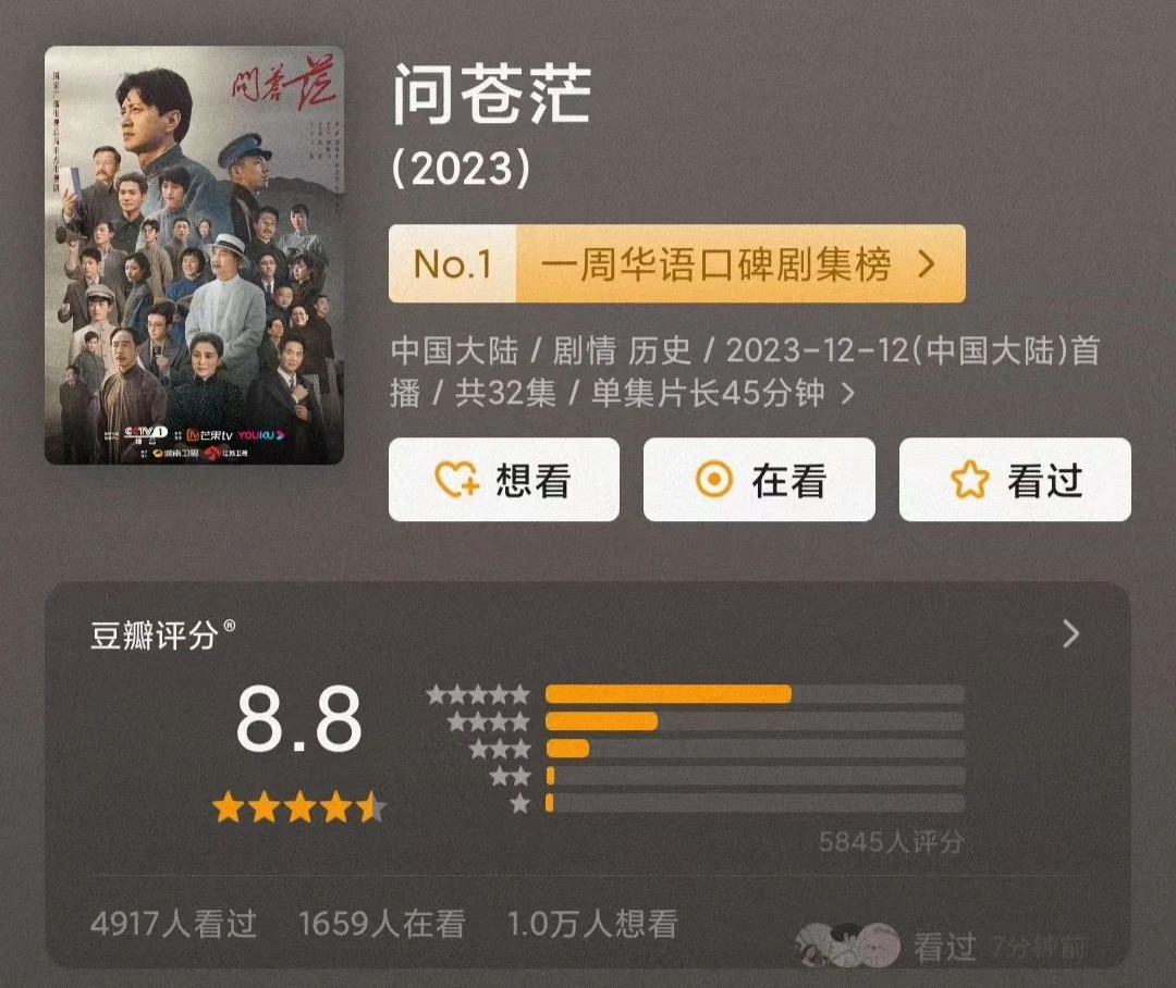 刚刚在中央电视台综合频道收官的《问苍茫》,献礼毛泽东诞辰130周年,聚焦1921-1927年毛泽东的蜕变与思想成长,凭借沉稳厚实的历史叙述和史诗交融的审美风格,赢来各方盛赞,豆瓣评分已升至8.8;援外医疗题材剧《欢迎来到麦乐村》,以别致新颖的情节和个性鲜明的人物致力于重大现实题材的鲜活表达,在国内外引发强烈反响,创下中非深度合作电视剧的先河;一部《云襄传》,国风美学的升级、以智胜武的创新设定、新武侠江湖的魅力,播出半年来多次斩获国内外奖项,成为了近年来武侠剧公认的标杆之作;《心想事成》讲述新北京的平民故事,追求细腻质朴的生活味道,在中央电视台电视剧频道CVB年度收视率排名中名列前茅。