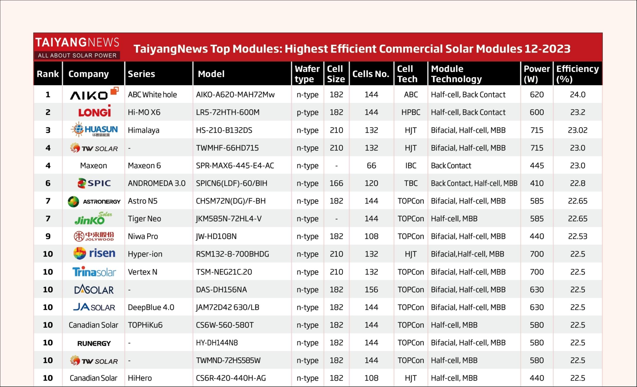 在公布的2023 年12月全球组件最高效率排名中,爱旭ABC组件以24%的转换效率位列榜首,这已是爱旭股份ABC 组件连续十个月排名第一,引领光伏行业进入组件转换效率24%+时代。