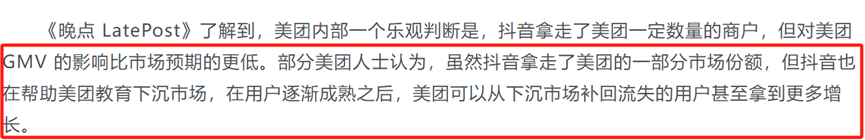 巧合的是,《晚点Latepost》报道称,部分美团人士认为,“虽然抖音拿走了美团的一部分市场份额,但抖音也在帮助美团教育下沉市场,在用户逐渐成熟之后,美团可以从下沉市场补回流失的用户甚至拿到更多增长”。[1]