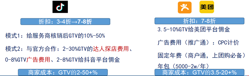 吸引商家的另一个利器就是“低成本”。为此,在抖音拓展早期,会为入驻的商家提供佣金减免、价格补贴等措施。但根据国信证券的研报显示,随着抖音优惠力度的减弱,商家在抖音上的综合成本,正在逐渐上升,甚至考虑到流量优势后,综合成本也和美团所差无几,甚至更高。[3]