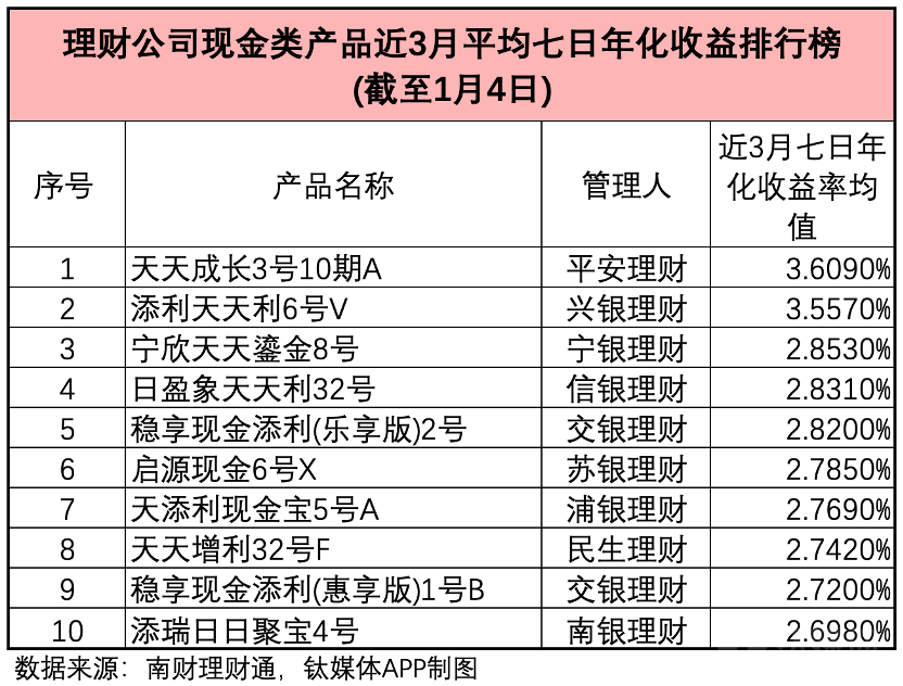 根据南财理财通数据,截至1月4日,理财公司现金类产品近3月平均七日年化收益排行前十榜中,斩获第一的是平安理财,交银理财的产品则在前十中占据两位。从收益率角度平安理财的产品“天天成长3号10期A”获得第一名,据钛媒体APP了解,该产品投资于存款、债券等债权类资产占组合总资产比例不低于80%,属于现金类理财,在市面上该产品已更新为“天天成长3号10期B”且额度已售罄,最新的七日年化利率达3.5911%。“天天成长3号”系列产品的七日年化收益率多数在2.2%至3.0%之间波动,属于市场平均水平,可见“10期”的表现无疑是市场投资人眼中的“香饽饽”,500亿元份额已处于售罄状态。