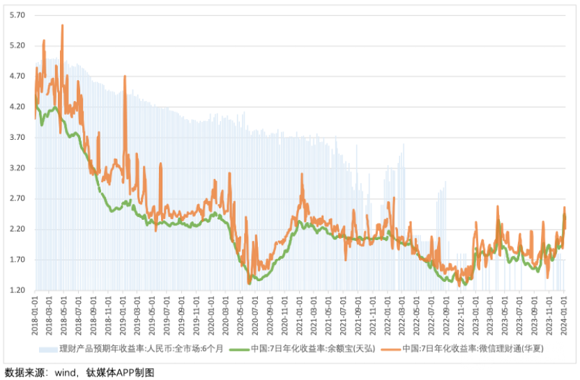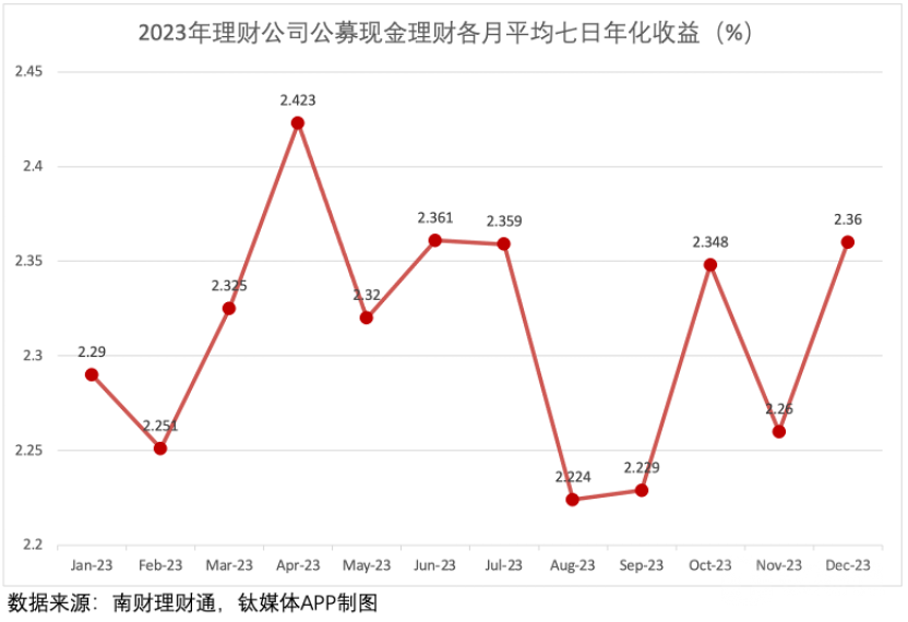 南财理财通数据显示,从2023年全年看,公募现金理财类产品的平均七日年化在2.2%至2.45%之间波动,通过计算得2023年四季度的七日年化均值为2.318%,呈现出震荡走势,主要原因是11月资金紧张情况放松,但受季末和年末影响,12月资金承压,12月单月平均七日年化走高至2.36%。据钛媒体APP了解,银行理财产品收益率年末翘尾属于季节性因素,主要受企业年末资金备付等需求导致的资金回笼和银行年底考核影响导致的同业间银行流动性紧缺,共同影响下产生了季节性的短期市场利率上升。