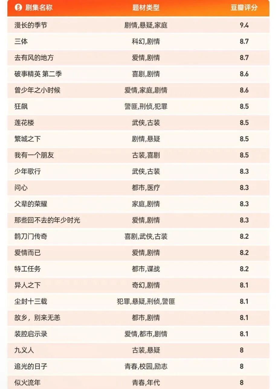 最后看豆瓣评分,23部剧评分8分以上,最高分为《漫长的季节》9.4,8.5分以上的剧目为《三体》《去有风的地方》《破事精英2》《曾少年之小时候》《狂飙》《莲花楼》《繁城之下》《我有一个朋友》。