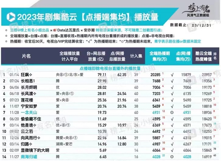 豆瓣榜上有名小组制作,根据酷云数据统计的榜单显示,2023年集均播放量4000万的剧目共有14部,分别是《狂飙》《长相思1》《长月烬明》《长风渡》《莲花楼》《安宁如梦》《一念关山》《偷偷藏不住》《他是谁》《云之羽》《向风而行》《归路》《显微镜下的大明》《南海归墟》。