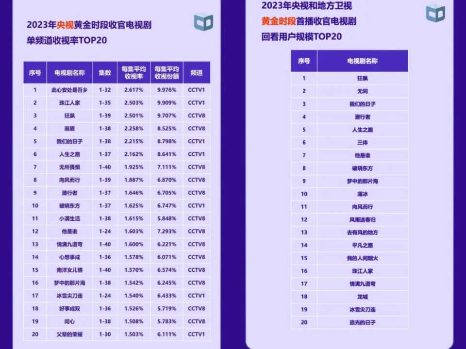 根据中国视听大数据显示,2023年央视黄金时段收官电视剧单频道收视率TOP3为《此心安处是吾乡》《珠江人家》《狂飙》;地方卫视黄金时段收官电视剧单频道收视率TOP3为《无间》《狂飙》《不完美受害人》(东方卫视包揽前三)。
