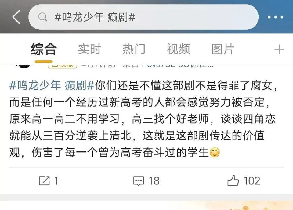 《鸣龙少年》被指“癫”,有一个维度的观众怨念确实值得创作者们注意:废柴经过抽筋拔骨的搓磨逆袭,固然热血沸腾值得敬佩,但不能盲目追求爽而罔顾事实逻辑。高考是人生大事,提高一分有多难,经过这一遭的人都知道。专科逆袭上本科可以,逆袭到985就有点不尊重了——这不摆明了告诉大家,十二年寒窗苦读纯纯无用,一年开挂就能清北复交随便选?底层逻辑垮了,失去对努力这件事本身的尊重,被骂不冤。