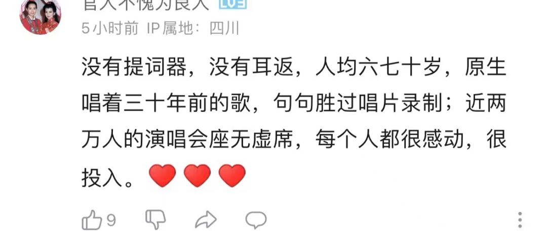 另一方面是引起群体情绪共振。“没有提词器,没有耳返,人均六七十岁,原声演唱三十年前的歌,句句胜似唱片录制。近两万人的体育馆现场座无虚席,每个人都很感动,很投入”、“那天夏天,啤酒瓶换回来的雪糕,打开黑白电视机,‘千年等一回,千年等一回’”。有网友在相关视频下方留言。