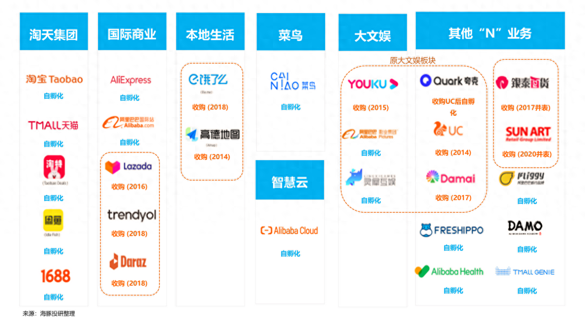 ② 本地生活服务基本全是收购而来,反映的是阿里从全国(球)性、平台性业务,向区域性、重履约性业务的拓展。重组后集团旗下的两个主要业务—高德地图和饿了么全是阿里分别在2014和2018年收购而来。至于面向酒旅业务的飞猪旅游虽是阿里内部孵化的,但反而已被剥离至“没人要”的“N”业务范畴内。