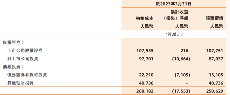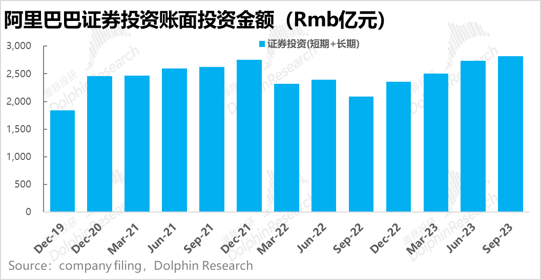 因此,可以说账面价值能较为准确的反映证券投资账目下的资产价值,而截至自然年(非财年)23年三季度的报告,阿里目前合计持有的证券类投资资产总价值为2817亿人民币,其中上市+非上市的权益类投资价值约为2200亿左右。