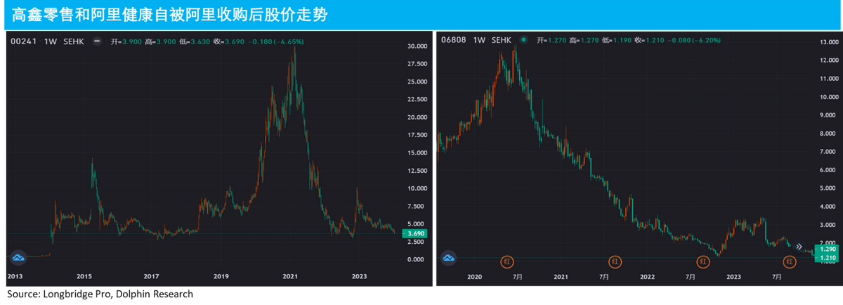 ① 以高鑫零售和阿里健康作为阿里并表收购上市公司的案例,可以看到高鑫零售自2020年低被阿里控股以来股价跌幅已近9成。而阿里健康在2014年底被阿里收购(并改名)后,虽然一度在2020-21的疫情水牛行情中上涨近10倍,但当前股价和8年前被收购后的价格基本持平。换言之,经历了8年在阿里旗下的发展后,市值却几乎零增长。