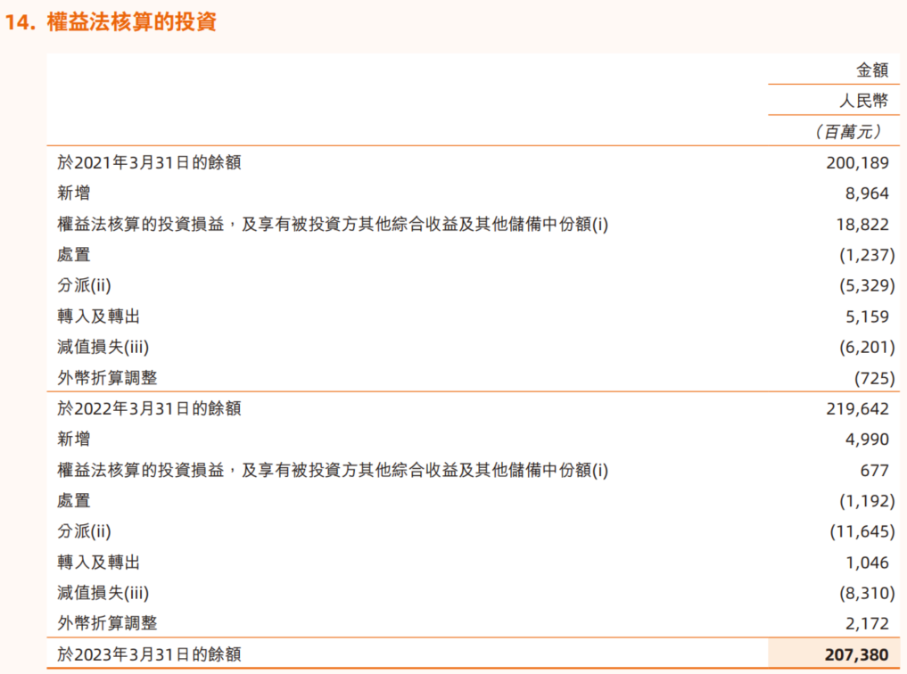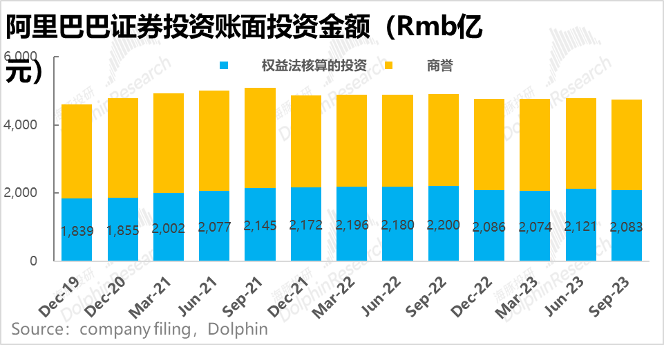 ② 此外,阿里目前账目上还有着约2000亿的以权益法记入的非控股股权投资,这部分价值是公司投资的有重大影响力、但不控股公司的账面净资产,乘以阿里持股的比例记入的。并虽阿里每年所享有。