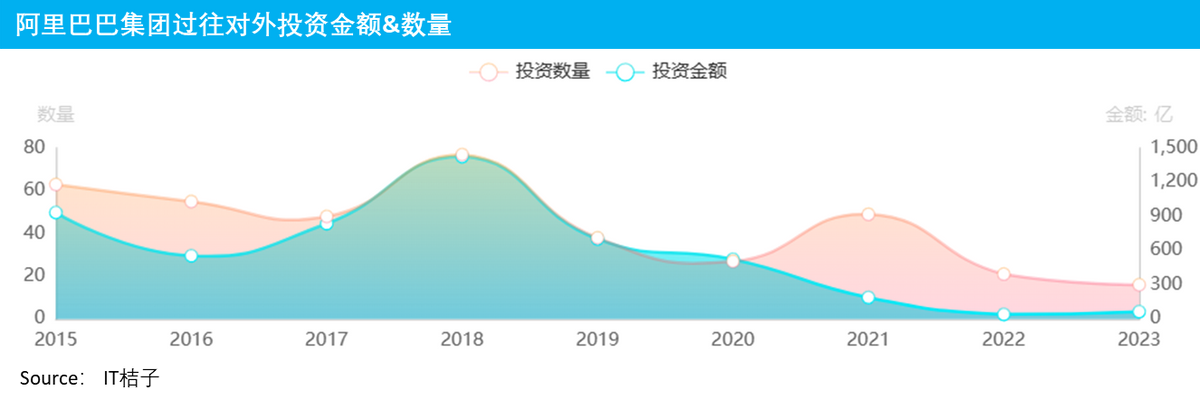 从投资时间节奏的角度,同样是以2017-2019年为高峰期。而在2020年后,虽然阿里对外风投的数量一年仍有20-50个左右,但投资金额在2021年后就快速下滑、并维持在不足百亿人民币的规模。