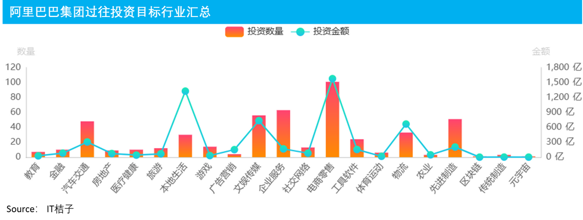 而在汽车交通、企业服务(可能与云服务相关)和先进制造这三个方向上,呈现投资数量较多但总金额并不太高的特征。按常理推测应当多数是体量较小的创业型公司,反映的是阿里押注的中长期机会。
