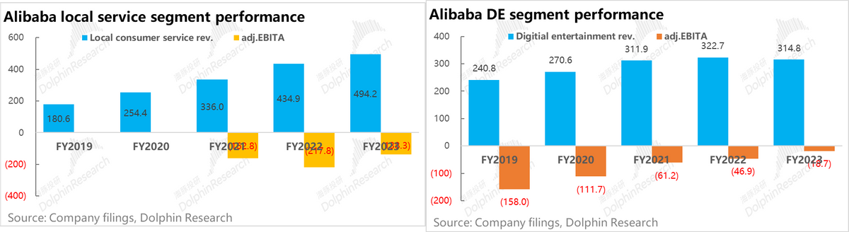 ② 而本地生活和大文娱这两个几乎完全由收购业务组成(但未上市)的板块,可以看到本地生活板块自2019-2023财年间营收尚增长了近3倍,尚有不错的表现。但大文娱板块同期数年间营收总增长不超过30%,显然是不好的成绩。不过两者共同的特点是,虽是收购而来,但在被阿里自行运营至少4-5年后,至今都尚未实现adj.EBITA层面的正盈利,显然也称不上好的表现。