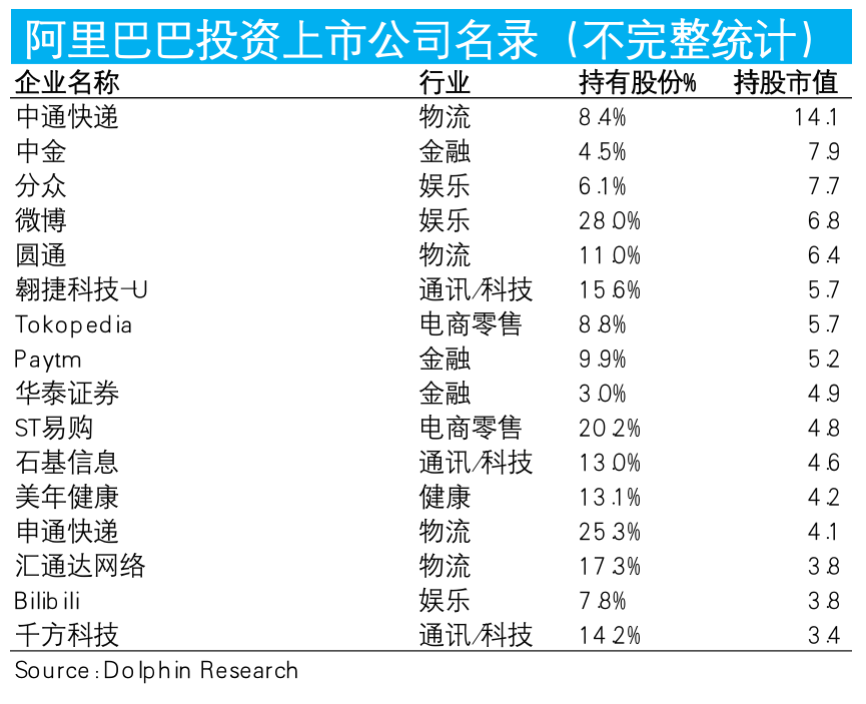 在第二层级,即阿里对外持股比例可观但不寻求控股的权益性投资上(一般在5%-30%左右)。由于阿里并不在财报中详细披露投资的公司名录和份额,我们梳理了(不完全统计)可查的阿里对外投资的名单如下表所示。