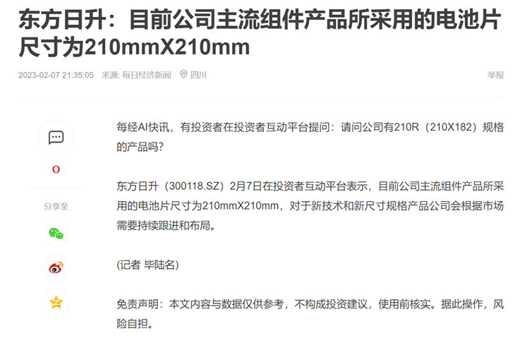 东方日升则在互动易上称,目前公司主流组件采用的尺寸为210mm*210mm。