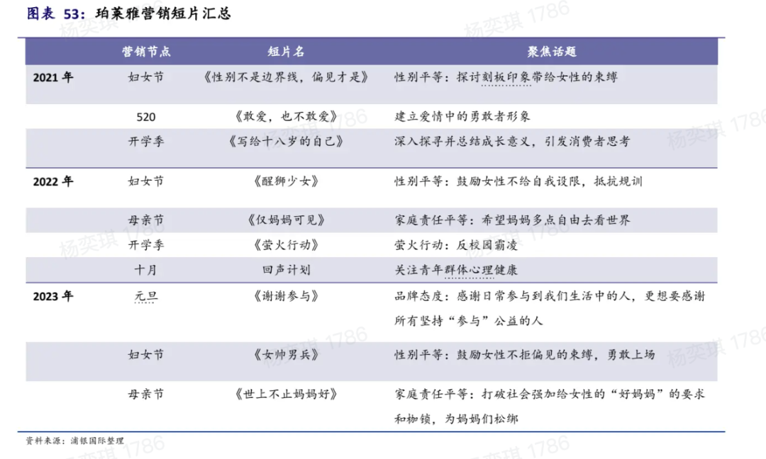 叶伟就是把欧莱雅这一套市场体系复制到珀莱雅。2021年至今,珀莱雅每年都会聚焦「性别平等」「爱与亲密关系」「心理健康」「青春与成长」这四个主题,在妇女节、开学季、母亲节等节日发布内容短片。