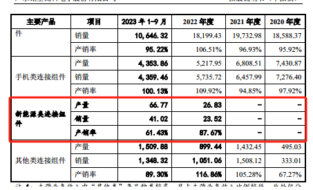 事实上,在2022年的时候,铭基高科计算机类连接组件、手机类连接组件的产量和销量就已经开始下滑,其产量分别为17087.07万条、5217.95万条,同比下滑16.06%、23.36%,销量分别为18199.43万条、5735.72万条,同比下滑7.77%、11.18%。