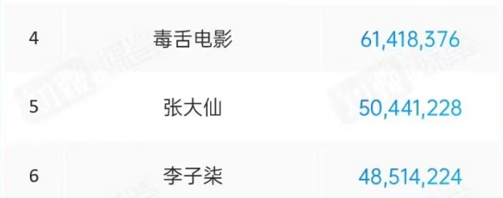 在抖音,排名前30的个人抖主当中,张大仙排在第5位,粉丝数量为5044万,在其前的是6141万的毒舌电影,在其后的是4851万的李子柒。