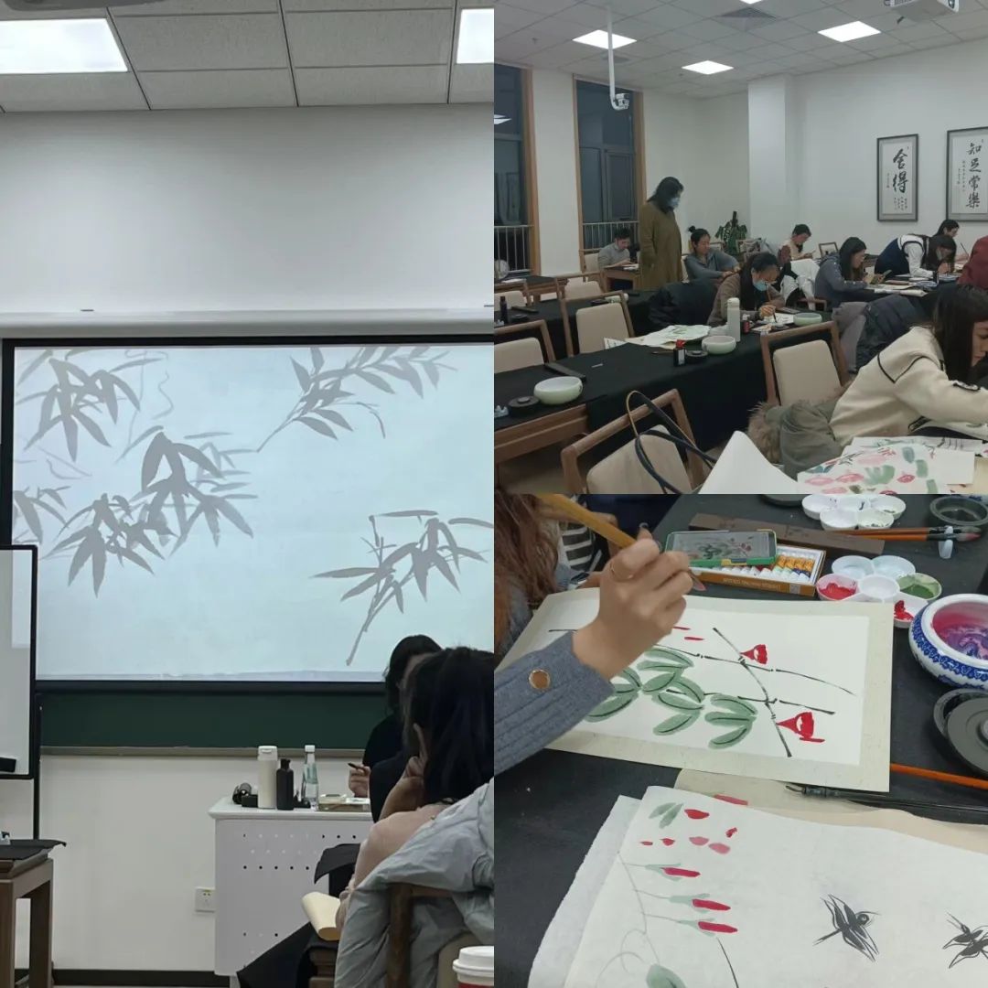 在阿静的写意花鸟课上,讲台上的摄像头对准老师的笔尖,一笔一画都被放大投影在老师身后的幕布上,学员们在台下跟着老师的节奏,临摹一幅幅竹子、葡萄、荔枝等。