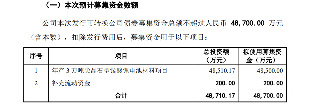 湘潭电化拟发行可转债募集资金4.87亿元,用于“年产3万吨尖晶石型锰酸锂电池材料”(下称项目一)与“补充流动资金”两个项目,使用募集资金分别为4.85亿元、200万元。值得注意的是,上述两个项目总投资额几乎全部来自募集资金。