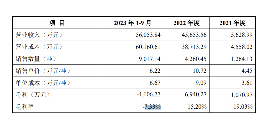 此外,由于碳酸锂价格大幅上涨及剧烈波动导致公司产能利用率较低,2021年至2023年1-9月,公司锰酸锂销量分别为1264.13吨、4260.45吨以及9017.14吨,其产能利用率分别为42.8%、39.22%、60.87%。