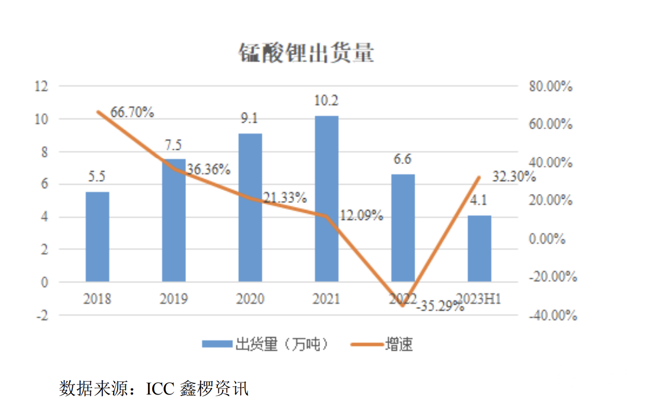 根据ICC鑫椤资讯统计,2018年-2021年我国锰酸锂出货量逐年上升,年均复合增长率达到22.86%,2021年出货量达10.2万吨。2022年受碳酸锂价格空前成倍上涨等因素影响,锰酸锂出货量为6.6万吨,同比下降35.29%。