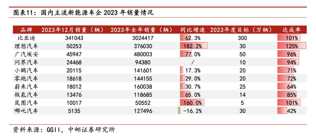 国内主流新能源车企2023年销量情况,图/中邮证券
