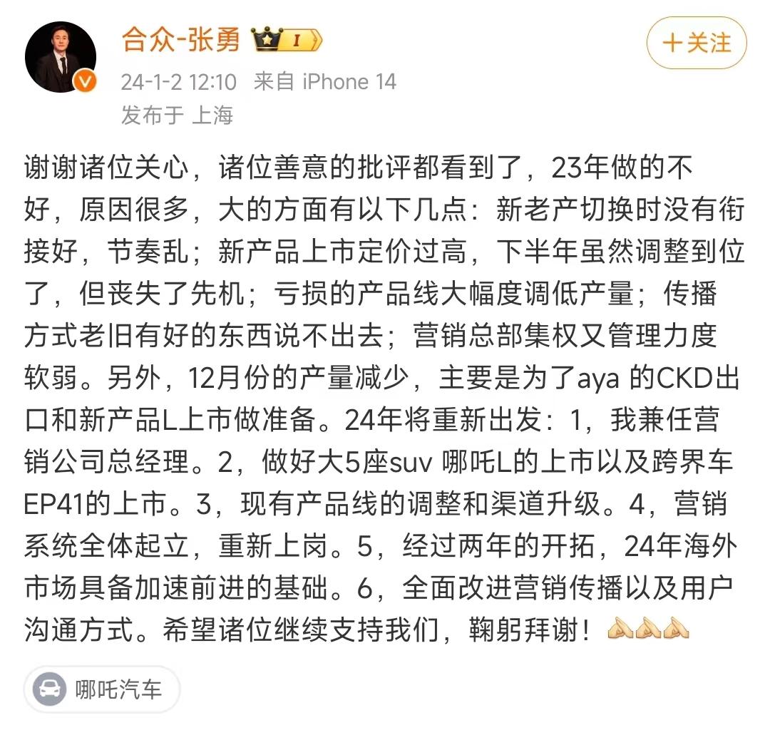 对此,哪吒汽车联合创始人、CEO张勇在社交媒体公开称,2024年他将兼任营销公司总经理、做好大5座SUV哪吒L的上市以及跨界车EP41的上市、做好现有产品线的调整和渠道升级,海外市场加速前进、全面改进营销传播以及用户沟通方式等。