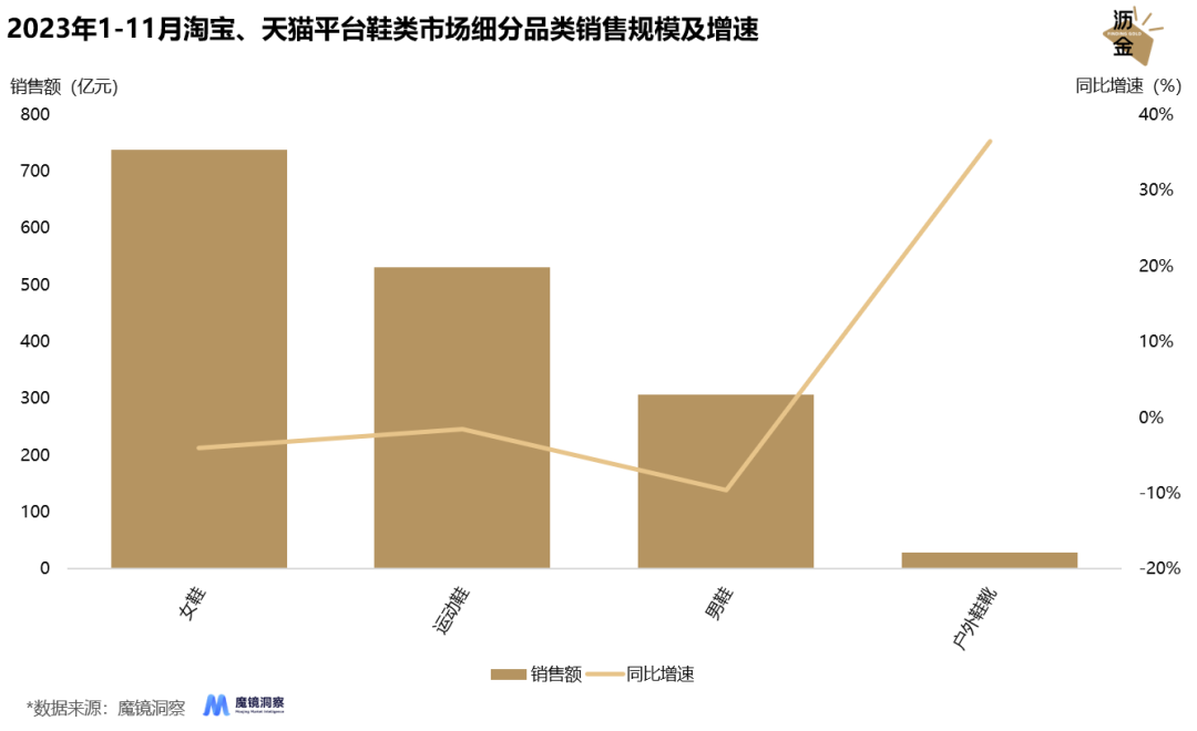 23年1-11月淘宝、天猫平台鞋类市场细分类销售规模及增速