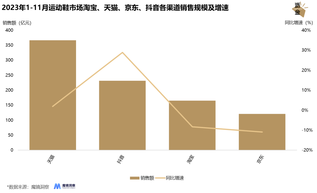就主流电商平台而言,该品类在天猫体量最大,以品牌自营为主,销售额同比增长1.9%。抖音平台作为后起之秀,体量相对较小,凭内容平台+兴趣电商的种草转化优势助推运动鞋市场进一步增长,销售额同比增速近30%。