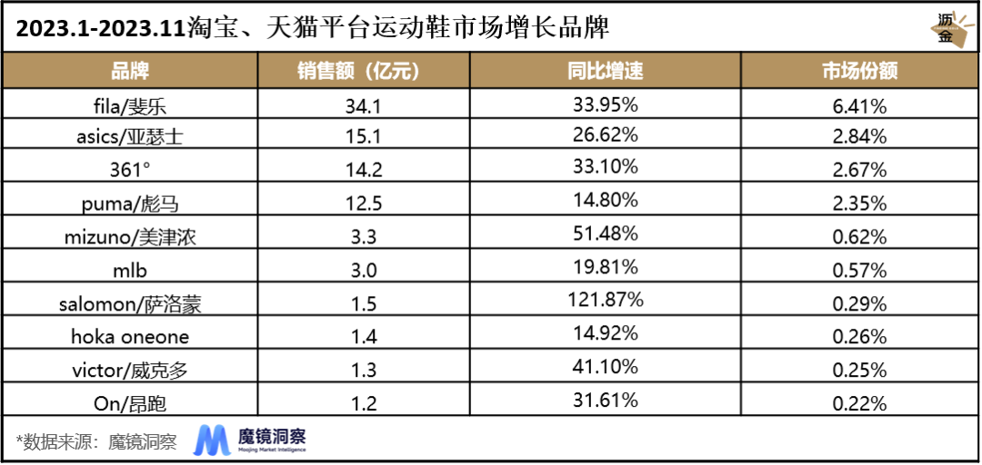 23年1-11月淘宝、天猫平台运动鞋市场增长品牌