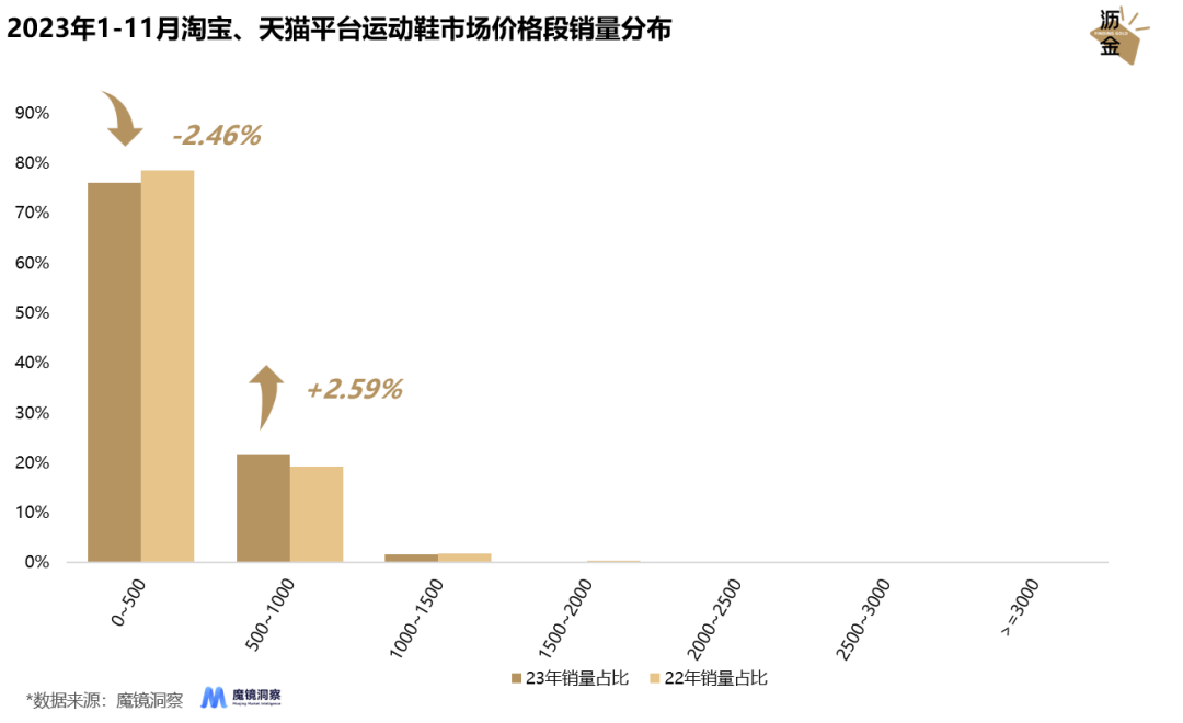 千元以下是运动鞋市场的主流价格段,其中0-500元销量占比高达76%。