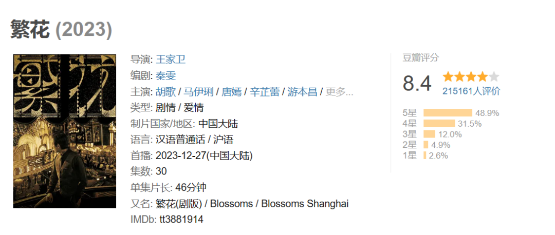 然而,随着剧情逐渐铺展开,舆论场上的质疑声逐渐减弱。当每个人物都逐渐立体后,王家卫的风格反而为情感关系赋予了某种“高级感”。《繁花》的豆瓣评分从8.1一路涨到8.3,并在完结后又升到8.4分。![]()