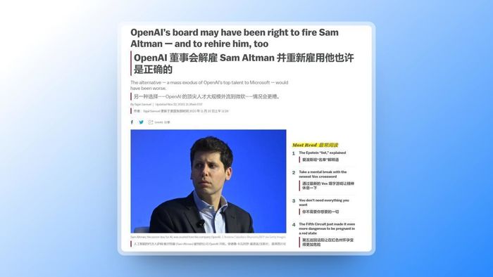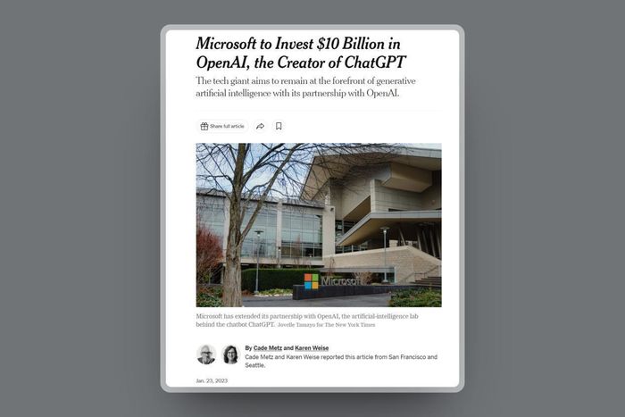 “The tech giant aims to remain at the forefront of generative artificial intelligence with its partnership with OpenAI.”(这家科技巨头希望通过与 OpenAI 的合作,保持在生成AI领域的领先地位。)——《纽约时报》