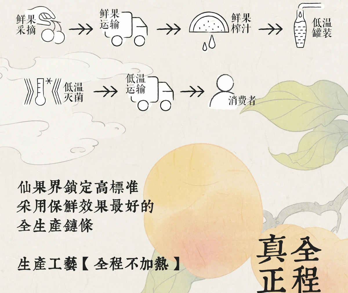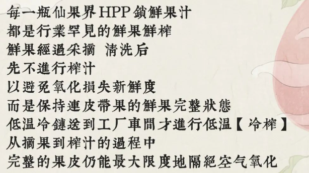 真低温,就得全程低温。在饮料品牌如果近期的全新高端品牌仙果界的微信推送中,就详细地讲解了主打鲜果现榨、配料表即水果本身、全程不加热的“真低温果汁”是如何生产的。
