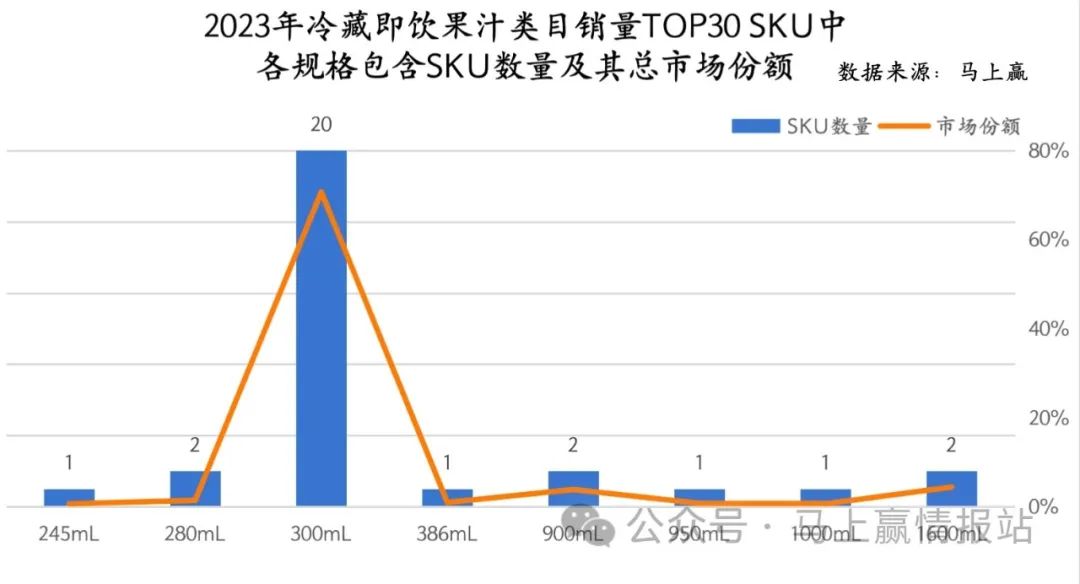 在TOP 30 SKU的规格分布情况上,可以看到,与其他类型饮料主力规格在500ml~600ml不同,冷藏即饮果汁的主力规格集中在300ml/瓶左右,该规格段(245ml~386ml)中的产品数量,以及产品对应的类目内市场份额均达到类目的70%左右。类目中的大规格产品从300ml左右的规格段直接上跳到900ml左右,在饮用场景上进入了分享场景。