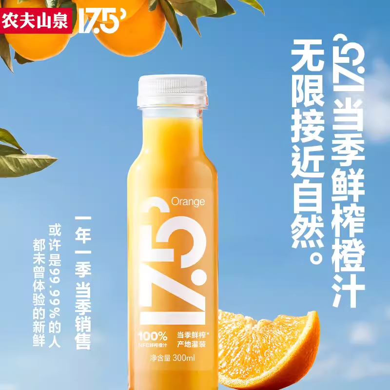 农夫山泉则更进一步,不仅连结了产地还突出当季。农夫山泉种了16年橙子,从橙汁源头开始布局。除了做橙汁,17.5°橙还会以鲜果形式进行直接售卖。2023年12月,农夫山泉推出了当季鲜榨、产地灌装的17.5°NFC橙汁,配料仅为当地新鲜脐橙,从鲜果采摘到果汁出厂不超过36小时;并且“遵循自然时间表”,只在当季售卖,12月29日过季即下架。