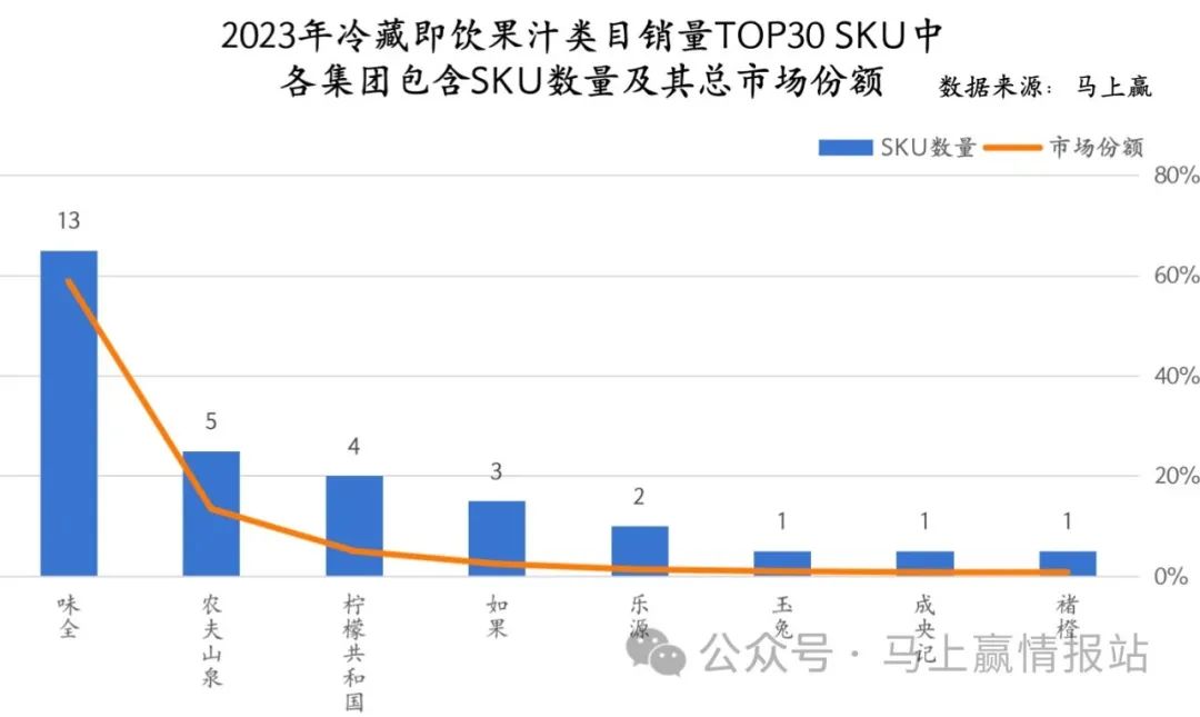 首先是TOP30 SKU的集团归属情况,味全以13款SKU占据第一,后几名集团在TOP 30以内的SKU数量也基本与CR10市场份额排名一致。