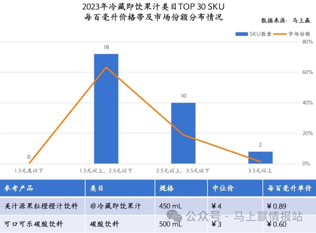 为了排除大规格产品件单价对价格带观察的影响,我们也一并算出了TOP 30 SKU产品的每百毫升价格带分布情况,并加入了非冷藏即饮果汁类目中的TOP产品美汁源果粒橙450ml,以及碳酸饮料中的TOP产品可口可乐500ml进行百毫升均价的对比参照。