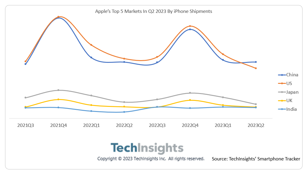 中国市场对苹果的重要性,我们可以通过很多市场数据以及苹果官方的动作来印证。2023年,市场调研机构TechInsights公布的数据显示,Q2,中国首次超过美国,成为iPhone出货量最大的单一市场。
