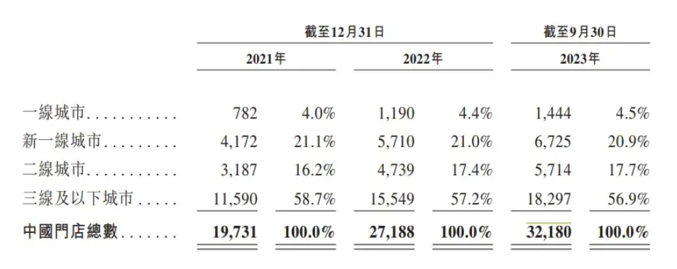 招股书显示,截止去年年底,古茗共拥有9001家门店,和蜜雪冰城一样主要集中在下沉市场。其中,二线及以下城市的占比为79%,一线和新一线城市分别只有3%和18%。2021-2022财年,古茗营收分别为43.84亿和55.59亿元,去年前三季度为55.71亿元,最新的净利润为10.02亿,赚钱能力倒是值得肯定。