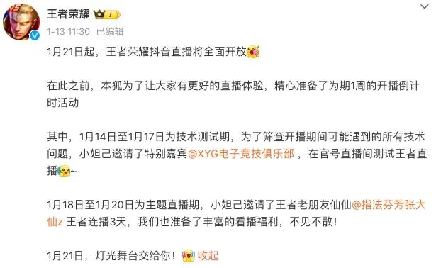 1月13日,腾讯旗下游戏《王者荣耀》官方发文称,自1月21日起,《王者荣耀》抖音直播将全面开放。