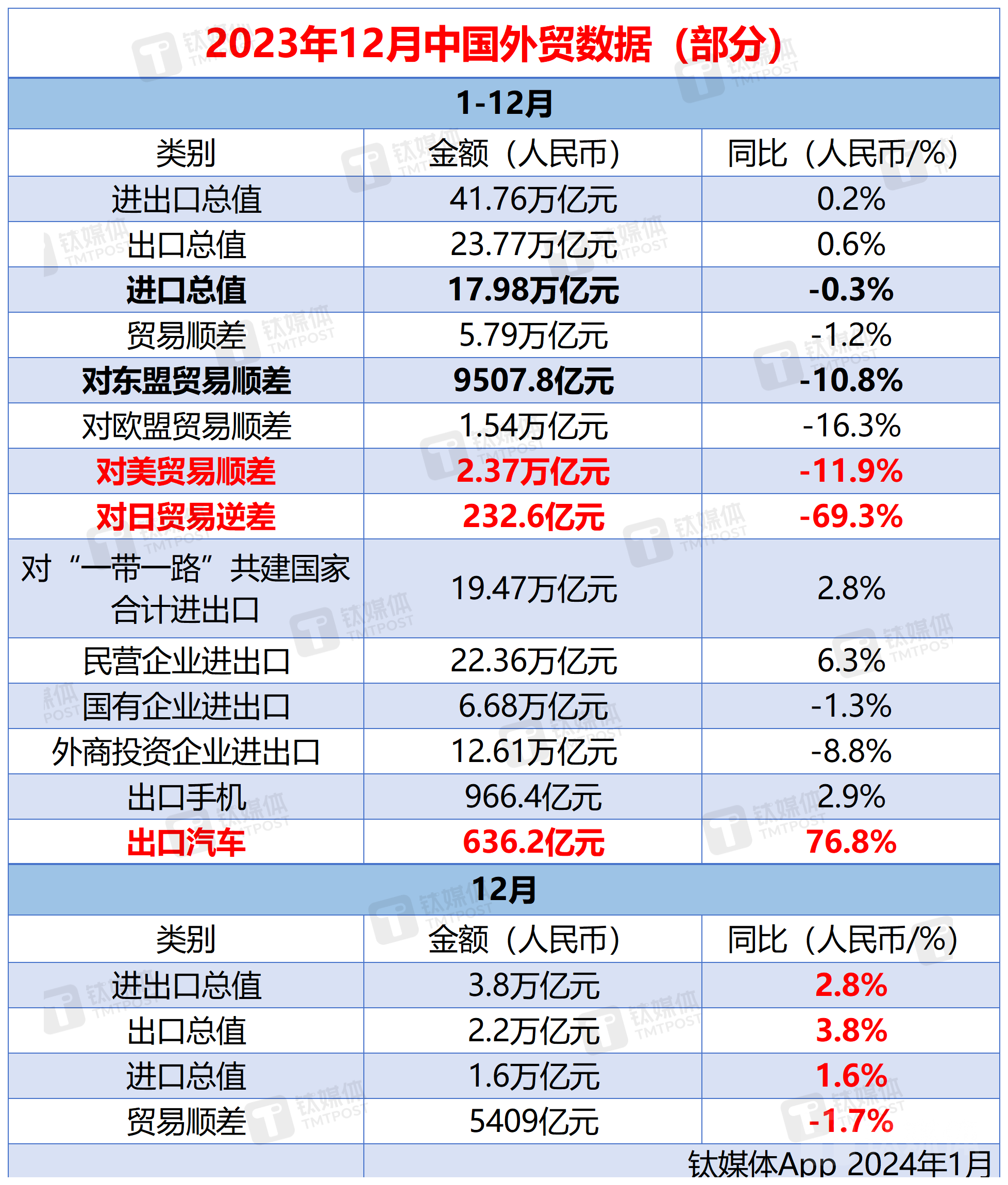 2023年外贸数据重点速览:进出口总值同比增长0.2%,出口汽车增长76.8%